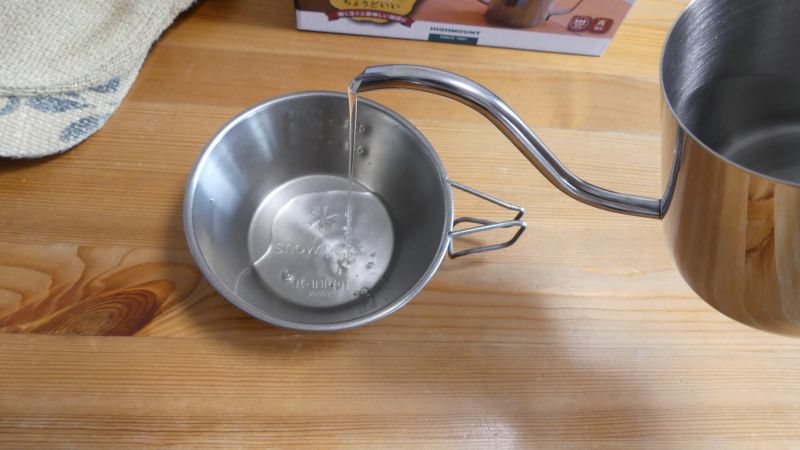 これなら1杯分の粉量のハンドドリップや、1杯用のドリップバッグにも狙ってお湯を注げます。