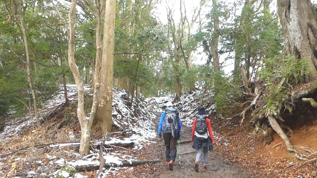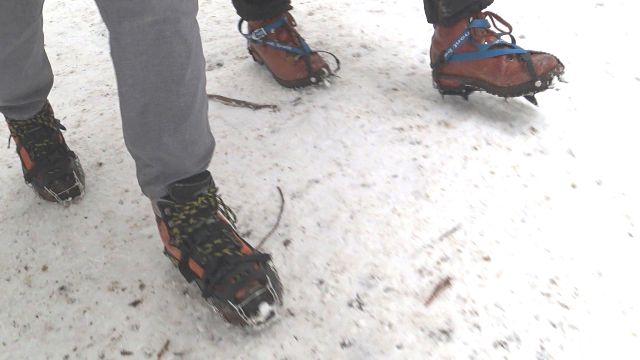 7合目付近から積雪が見られたのでアイゼン(スノースパイク)を装着しました。今回の積雪状況では装着しなくてもいけそうでしたが、冬登山では路面凍結の可能性が高いので最低でも4本爪アイゼンの持参は必須です。私が使っているのはモンベルのスノースパイク10のML。4本爪はゲタで歩いているような歩きにくさがありますが、10本あると接地面がフラットになるので歩きやすいです。