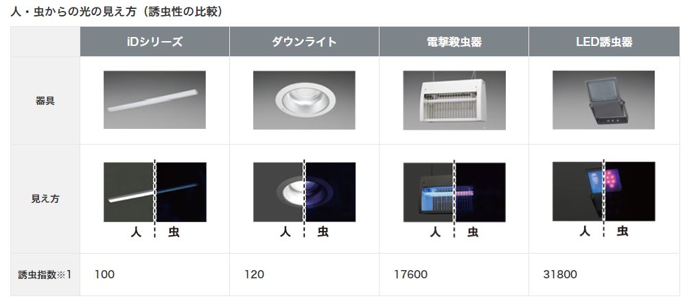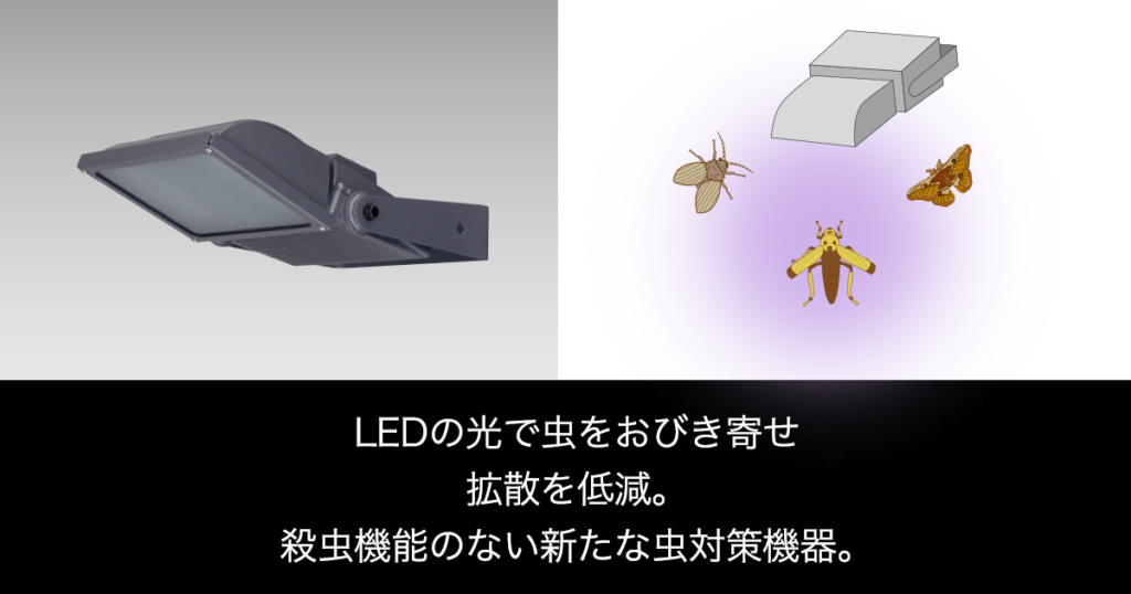 虫を誘い寄せる「誘虫指数」は、ダウンライトに比べて250倍、電撃殺虫機に比べて1.8倍。