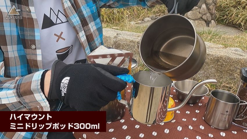 山コーヒーのドリップに使ったポット。重さ200gと軽く、狙った場所に細く注湯することができます。300mlはギリギリ2杯分の容量なので基本的にはソロ用途向け。直火OKですが、沸騰させると注ぎ口からお湯が噴き出すうえに取っ手が非常に熱くなります。シルバーの他に、ブラックとカッパー(銅)があり、450mlサイズもあります。
