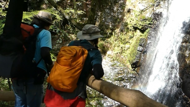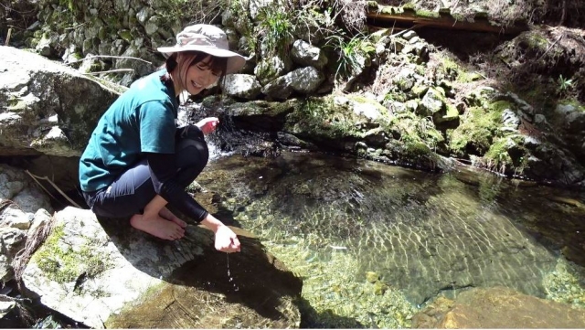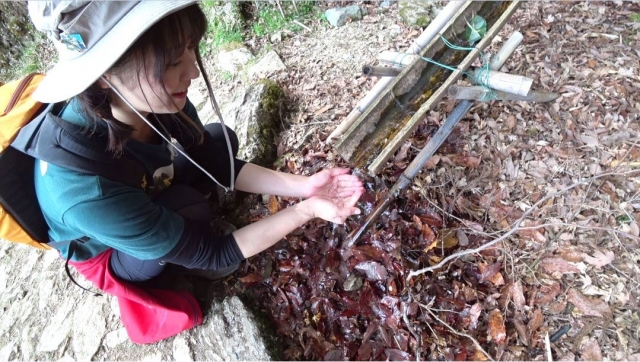 奈良県の「やまとの水」に選定されている奥千本の苔清水。水量は豊富でした。山と高原地図には水場マークが付いていないポイントなので生水での飲み過ぎに注意してください。ちなみに中村さんは自他共に認める「強い胃腸」の持ち主で、海外ロケでまわりのタレント・スタッフが腹痛にやられていても平然としていたそうです。