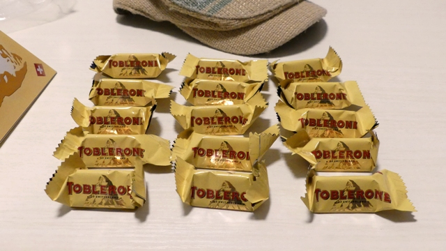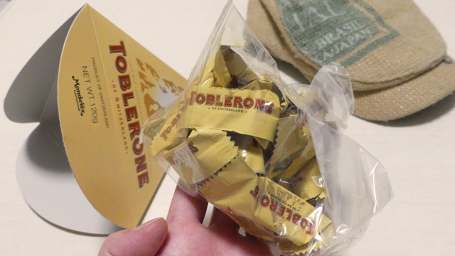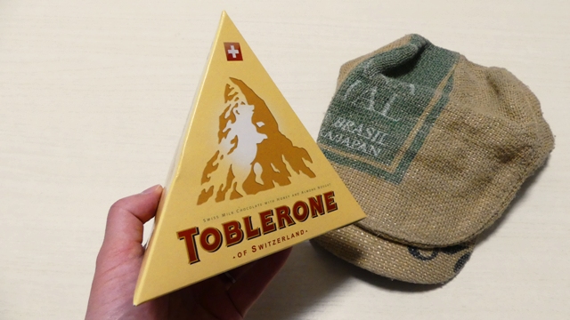 味に関しては「海外の普通のチョコ」といった印象ですが、やはりこのトブラローネは三角パッケージのマッターホルンデザインのインパクト、中のチョコも山をイメージした三角というのが良いと思います。私自身、これをプレゼントされたら嬉しいです。