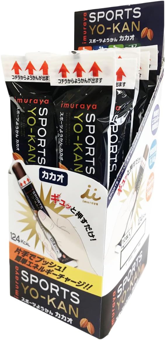 こちらも井村屋の、携帯ようかんチューブ・カカオ味。袋をギュッと押すだけで食べることができます。スピーディーに栄養補給でき、1本あたりのカロリーは124kcal。