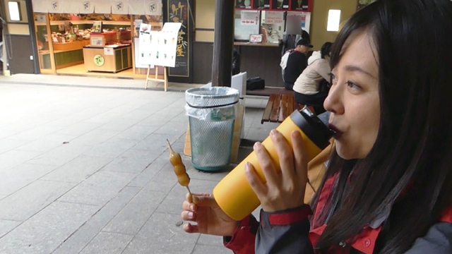 トロッコ嵐山駅前の屋台で団子を買って、コーヒーの残りを飲みながら小休止。ESPROのトラベルプレスは蓋が密閉できて持ち運べるのが利点です。