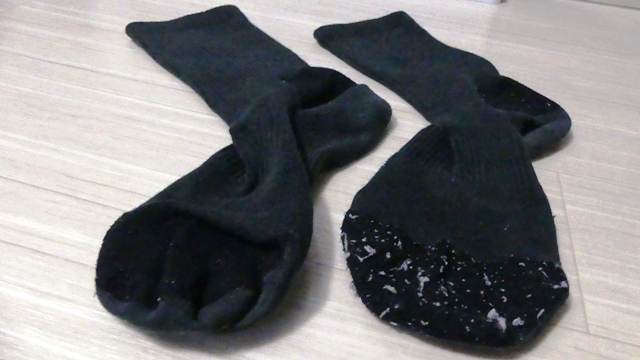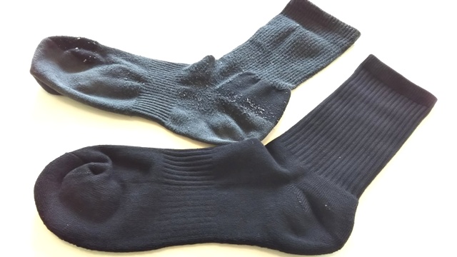 ハードタイプで気になるのはレギュラータイプにはあった「優れた吸水・速乾性」「抗菌防臭加工」が説明書きに無かった点。ハードタイプをしばらく履いて確認したいと思いますが、足のニオイが気になる人はレギュラータイプを選んだほうがいいかもしれません。