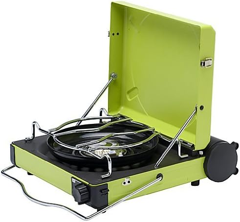 飯能河原のバーベキューで使った黄緑色の蓋つきカセットコンロ、イワタニの「カセットフー マーベラス」がモデルです。風除け付きでハイパワー&携帯性が魅力。重量3kgで多少重く値段も張りますが、プレートの拡張性や収納性などが秀逸です。現在はシャンパンゴールドカラーのマーベラス2にバージョンアップしています。
