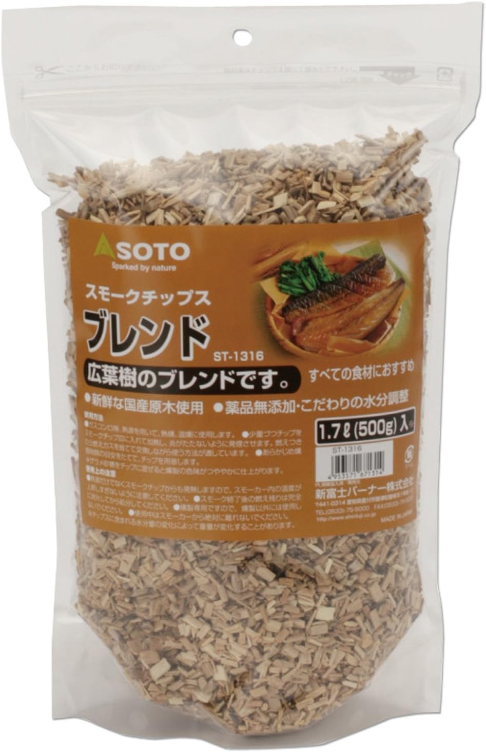 伊刈が燻製に使っていたチップはソトのブレンドでした。新鮮な国産原木のみが使われ、薬品も無添加。自然のままのクセのない香りが楽しめます。燻製初心者からベテランまで愛用しているチップで、万人受けする燻製が作れます。慣れてきたらこれに別のチップを足して自分流の燻製を作ったりするのが王道のようです。伊刈のテーブルには燻製チップが3袋あったので独自のブレンドをしているのだと思います。