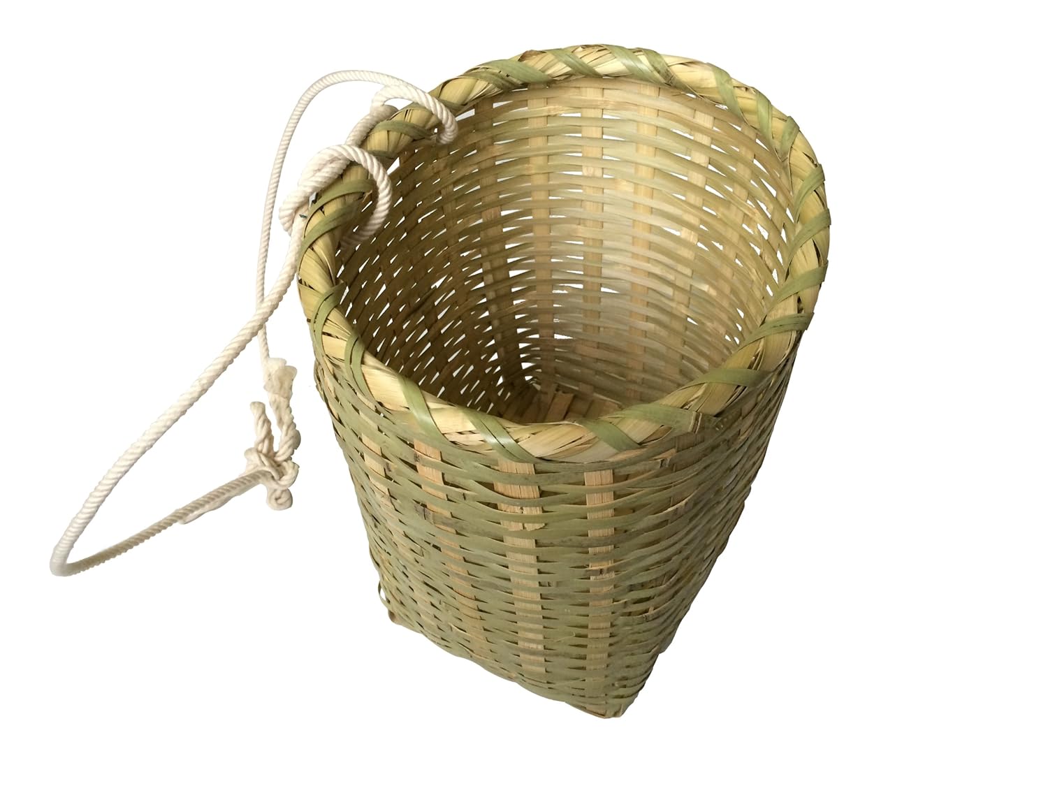 山菜を取るのに使っていたカゴは、越田弥吉商店のものだと思われます。竹で編まれたカゴは通気性が良く、ナイロン袋などに比べて山菜の鮮度を保つことができます。縦に太めの竹、横に細めの竹を使ったゴザ目編みのカゴは強度があり、ある程度の重さに耐えられます。隙間も少ないので小さな収穫物に適しています。