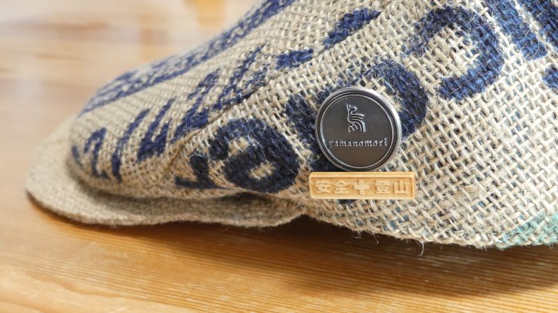 新コーヒーハンチング帽に、ヤマノモリの安全登山ピンズを装着。