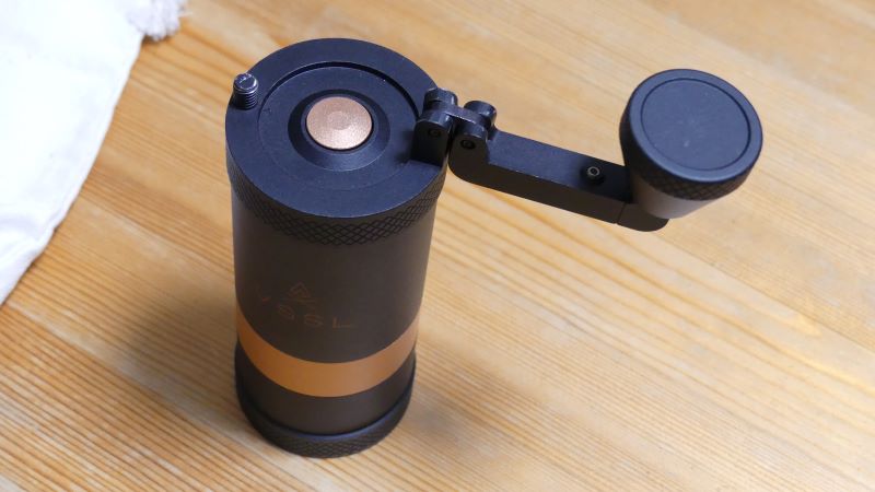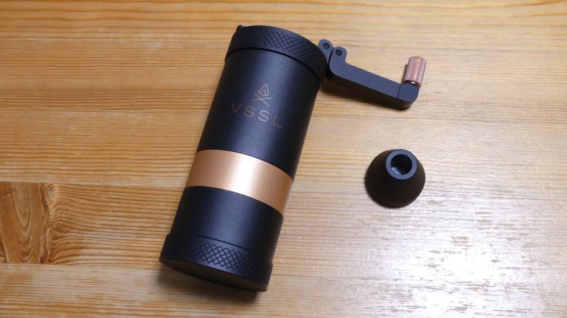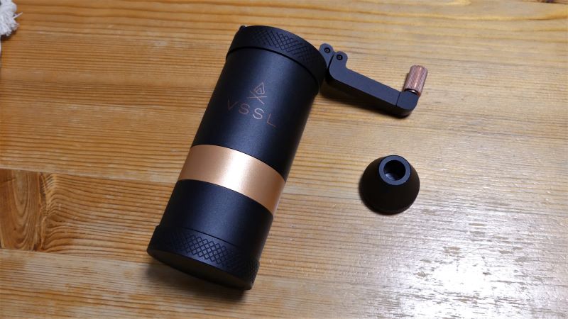 VSSLのジャバコーヒーグラインダー。高級感のあるデザインで、軽快に豆が挽け、ハンドル収納機構も良くできています。
