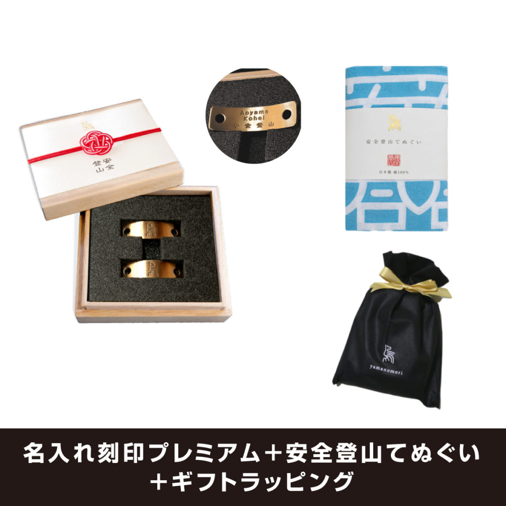 プレミアムセットは、フルネームでの名入れ刻印&手ぬぐい付き&ギフトラッピングありで登山プレゼントにおすすめです。