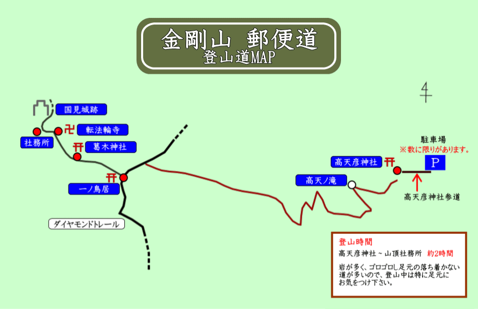 鳥井戸バス停から高天彦神社(読み方:たかまひこじんじゃ)までが2.5kmで歩行時間は約50分。神社近くに公衆トイレあり。