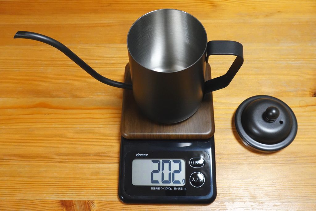 ハイマウントのミニドリップポット・ブラック450のフタ無し重量は202gでした。300より67g重くなります。