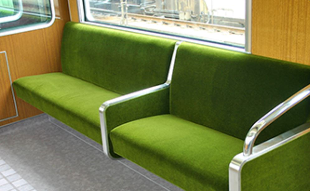 阪急電車の緑色の座席、正式名称は「ゴールデンオリーブ」です。昔は赤褐色や紺色の時代もあったそうですが、1960年以降はゴールデンオリーブが主流に。従来色に比べて車内が明るく広く見える効果もあるそうです。