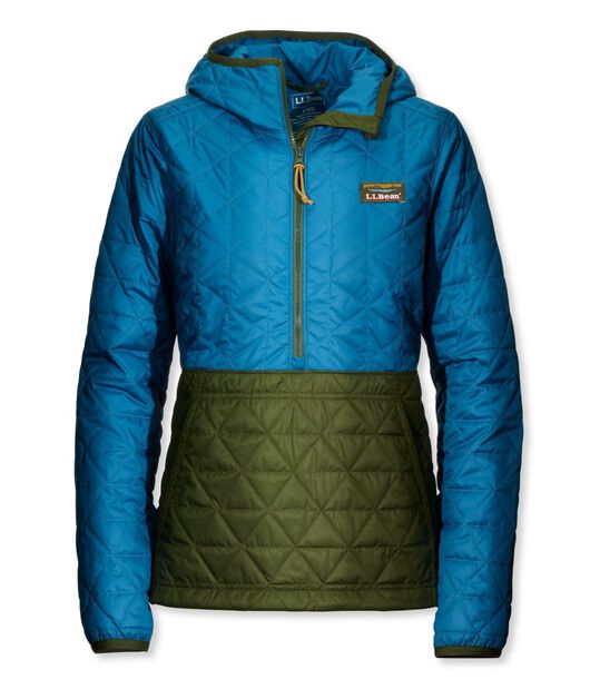 リンがポンチョの下に着ていたプルオーバーは、LLBeanのカタディン・インサレーテッド・プルオーバー・カラーブロックでした。中綿は軽量で保温性のあるプリマロフト。快適最低気温は7℃から-21℃で、街使いから寒い時期のキャンプまで幅広く使えます。防水加工も施され、フード周りと袖口は風雨の侵入を防げるようゴム製素材が使われています。なお、メンズの同型プルオーバーもあります。