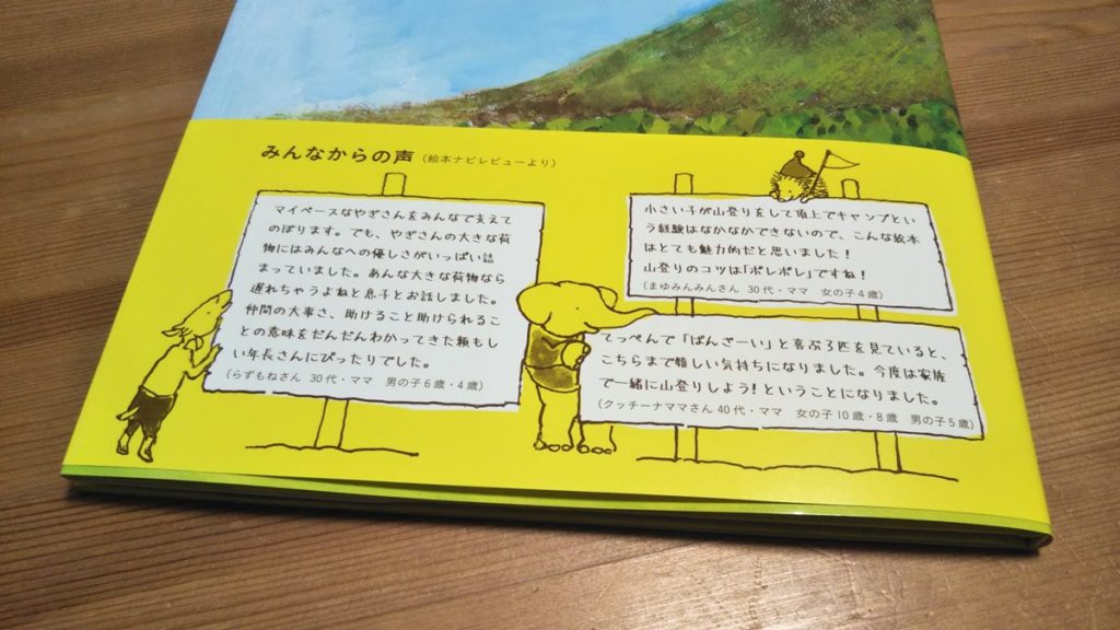 小さい子が山登りをして頂上でキャンプという経験はなかなかできないので、こんな絵本はとても魅力的だと思いました! 山登りのコツは「ポレポレ」ですね!