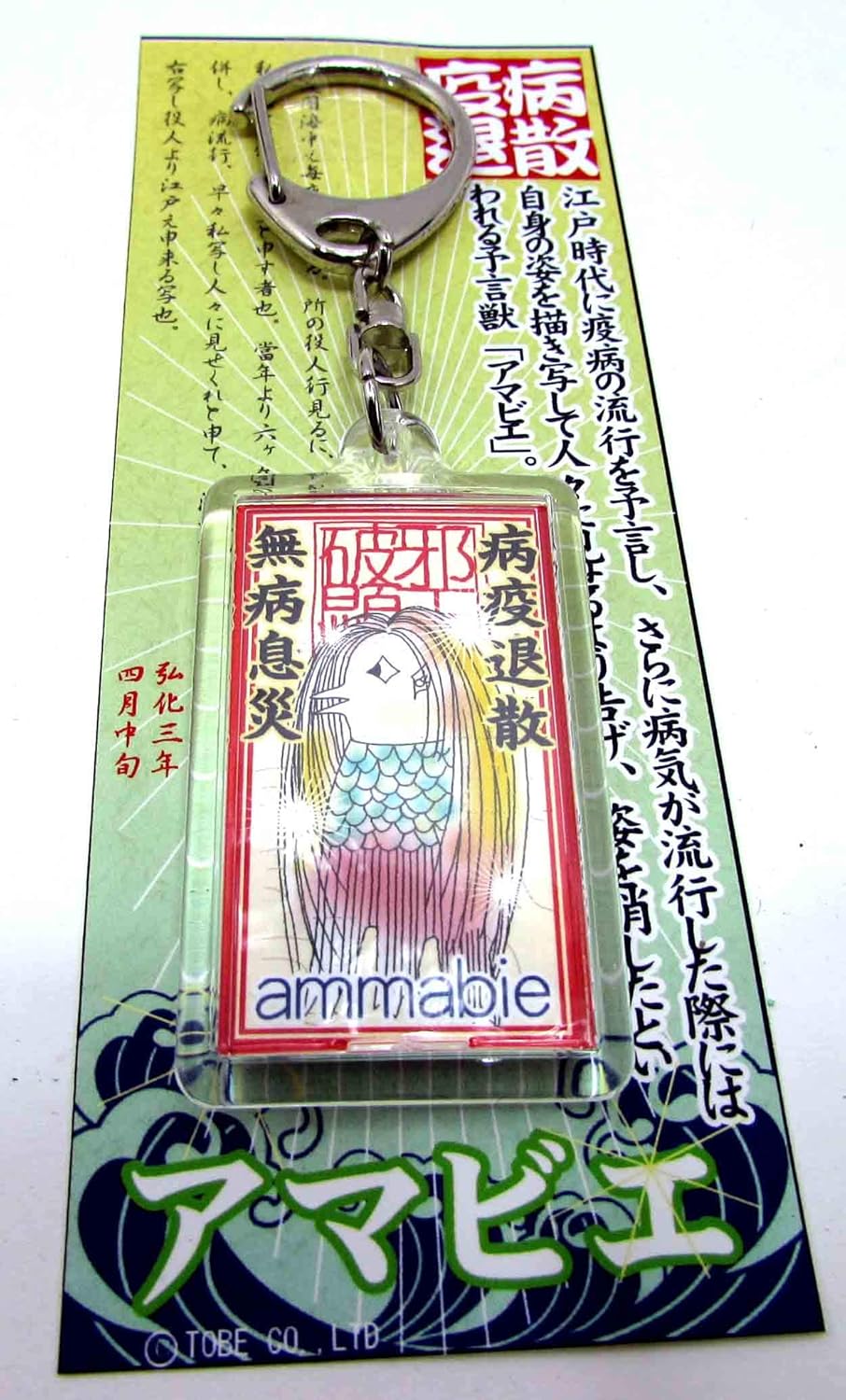 アマビエのキーホルダー。よく見ると、「疫病退散」の文字が「病疫退散」と誤字ミスしています。デザイナーチェックが十分にできないまま入稿してしまったようです。かなり急いで作ったんですね。