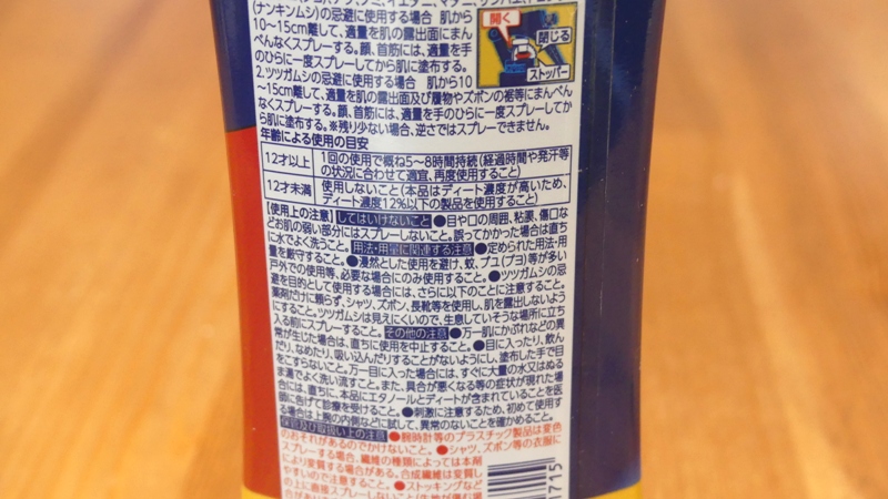 また、高濃度でディートが入っているので肌が弱い人には合わない可能性があり、12歳以下の子供には使えないのでご注意ください。