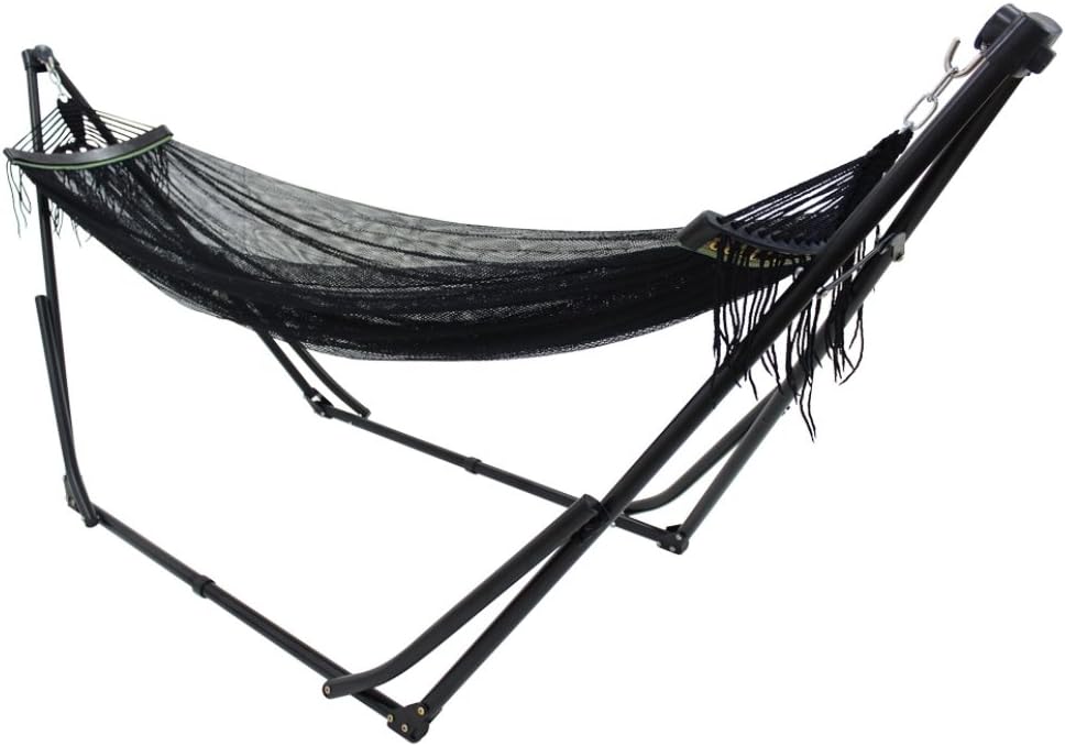 フレームの土台付きのハンモック。ハンモックの設置は木に引っ掛ける作業が慣れていないと面倒なのですが、これなら全くの初心者でも簡単に設営できます。屋外はもちろん、室内でも利用可能。
