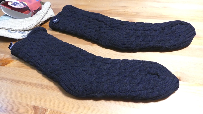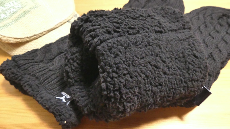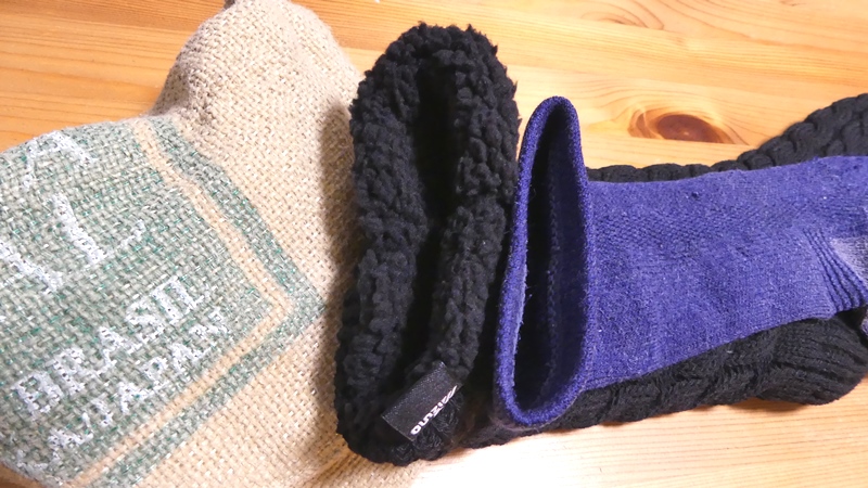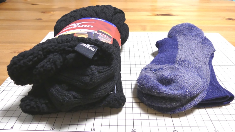右側にある青いソックスは、私が登山で使っている中厚ソックス。普通のソックスより厚いのですが、ミズノの裏ボアが極厚過ぎて薄く見えます。