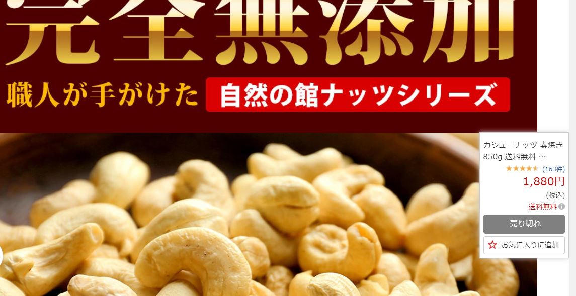楽天市場全店で大規模にセールをやっていて、自然の館のカシューナッツはすべて完売。