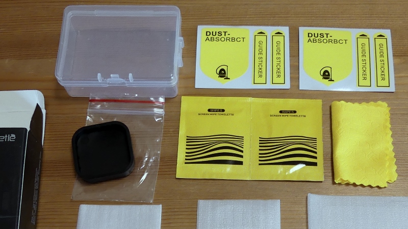 箱を開けてみると、保護フィルム貼りに失敗したとき用の予備以外に、レンズ拭き用のミニタオル2枚、細かいホコリを取るシール、ウェットワイプ2枚、そしてメインカメラのレンズキャップも付いていました。