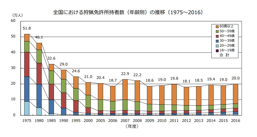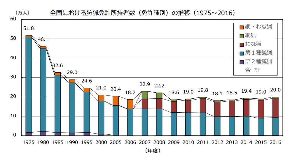 2008年に施行された猟銃所持の規制強化などの影響で新規ハンター増加が難しくなっているのが原因のひとつのようです。