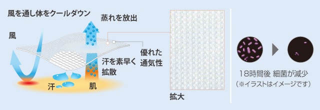 このクールメッシュは高性能吸湿速乾生地「ジオライン」をメッシュ状に編みこみ、体との接地面積を少なくしています。通気性が良いため生地内に熱がこもりにくくて蒸れにくいです。