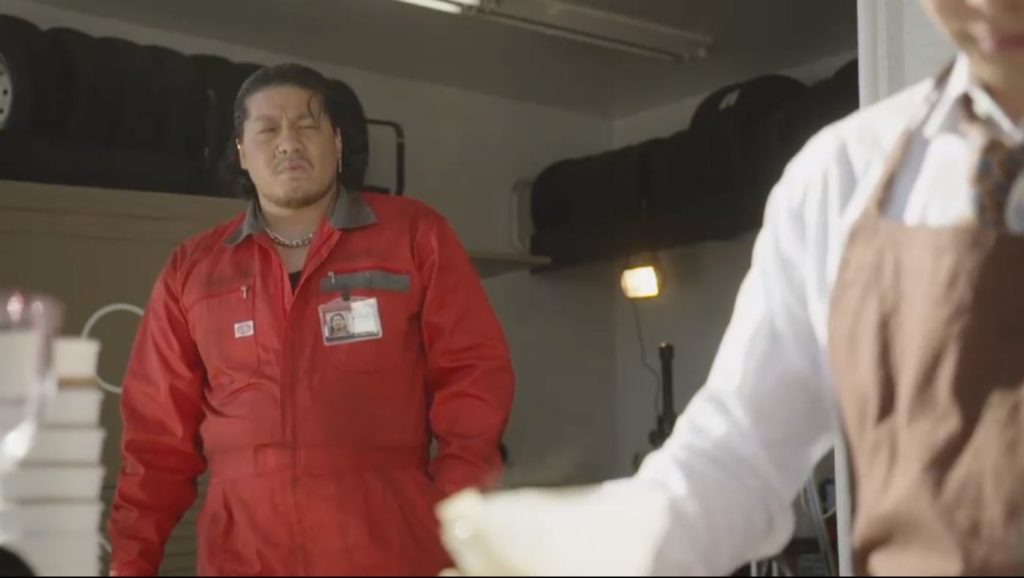 ガソリンスタンドの店主・ゴンザ(一ノ瀬ワタルさん)が着ている作業着は、山田辰のツナギ ab-5650のレッドです。縮みが少なくシワになりにくい二重構造糸の高級素材・TWOACE(ツーエース)を使用。綿タッチ素材でオールシーズン使えます。