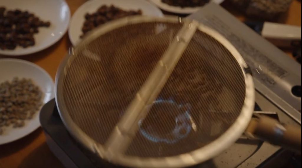 青山が自宅で手網焙煎をしているシーンで使っていたギンナン煎り器、いくつか同じタイプがありますが和平フレイズの煎りアミが近似しています。手網焙煎は火加減が難しく、豆全体に均一に火を通すために網を振り続ける必要があり、けっこう腕が疲れます。また、コンロ周りがチャフ(豆の皮のカス)でめっちゃ汚れるので、青山がやっていたようにカセットコンロでやったほうが後の掃除が楽です。