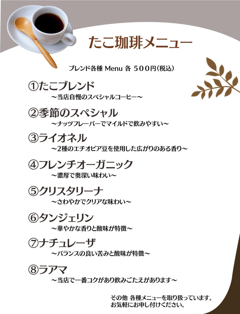 コーヒーの種類は、たこブレンド、季節のスペシャル、ライオネル、フレンチオーガニック、クリスタリーナ、タンジェリン、ナチュレーザ、ラアマの8種類。