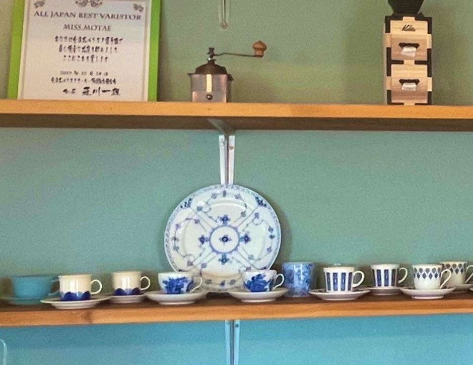 モタエさんの賞状の右下にあるコーヒーカップは、デンマークの高級陶磁器メーカー・ロイヤルコペンハーゲンのブルーフラワーコーヒーカップ。ロイヤルコペンハーゲンを代表する美しいブルーの装飾が施されています。カップのデザインはすべて手描きのため、花の種類や濃淡などはひとつずつ微妙に異なります。