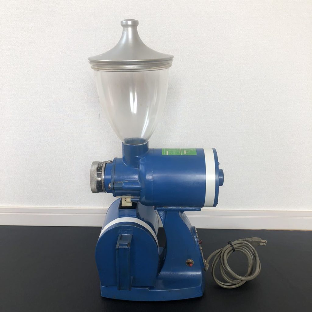 モタエカフェに置いてあるアンティークな青いコーヒーミル。これは富士珈琲機械製作所(現:フジローヤル)の「The Fuji No.80」の青カラーです。業務用ミル・フジローヤルR-440の前モデルと思われますが、古い機種なので詳しい情報は得られませんでした。みるっこよりワンランク上の価格帯で、粒度が一定かつ微粉の少ない粉挽きが可能です。