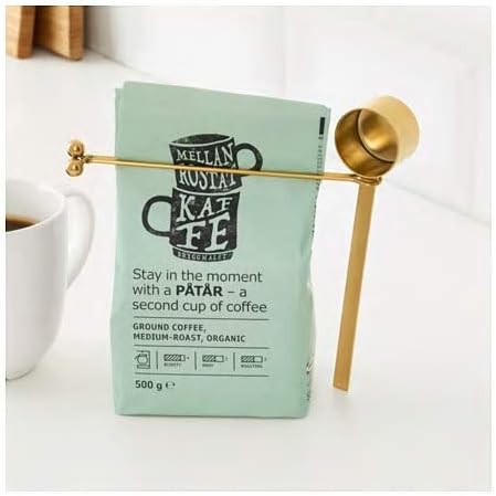コーヒー豆をすくうのに使っているコーヒーメジャースプーンは、柄の形状的にIKEA(イケア)でも売っているテンペレラードのコーヒーメジャー&クリップです。真鍮製でアンティーク感がおしゃれ。スプーンひとすくいで約5gが計れ、定価が399円と安価なのですがイケアではすでに生産終了品に。amazon・楽天でプレミア価格がついています。