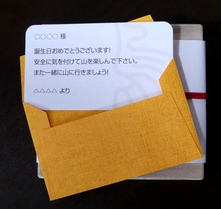 プレゼントとして手渡す時には是非「安全登山で山を楽しんでね」と言葉をお贈りください。受け取った側に強く印象を与えるほど、心理効果は高まります。