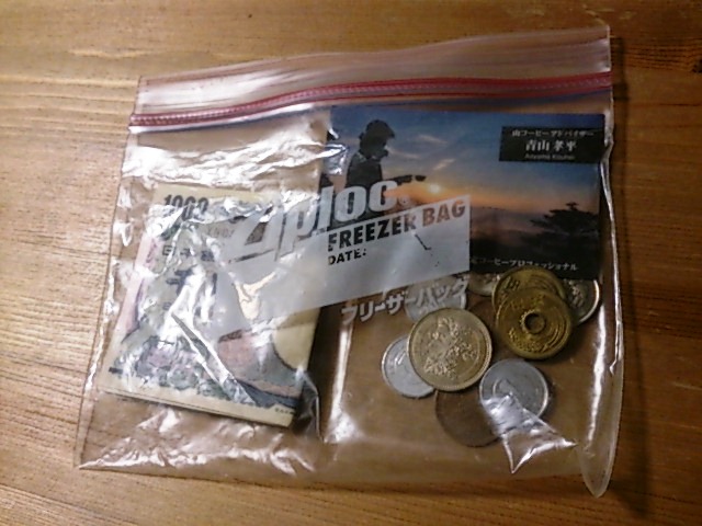 使い勝手の良い完全防水サイフが見当たらなかったので、「山財布&ジップロック」に落ち着きました。これならデザインの気に入ったサイフでもお札だけを濡れから守る事ができます。お札の出し入れがちょっと面倒なのがデメリットですが、山にいる間だけと思えばこれくらいの手間は許容範囲かなと。