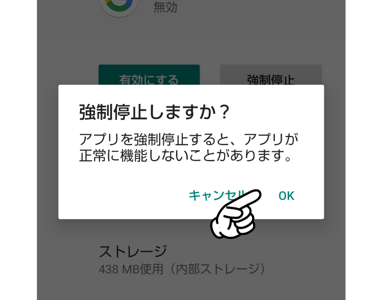 次の画面で「強制停止」をタップし、「OK」をタップします。