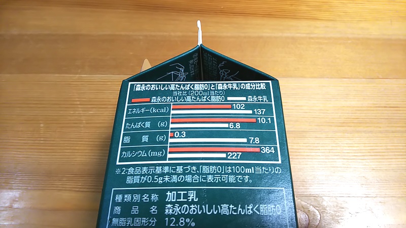 「森永のおいしい高たんぱく脂肪0」は牛乳ではなく加工乳。商品名に「牛乳」の文字が入っておらず、低脂肪牛乳に近い組成になっています。