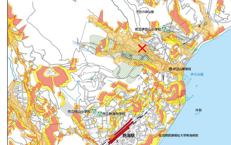 今回の熱海の土砂災害現場は、ハザードマップでは「特別警戒区域・土石流(赤)」と「警戒区域・土石流(オレンジ)」「警戒区域・地すべり(緑斜線)」が混在していました。