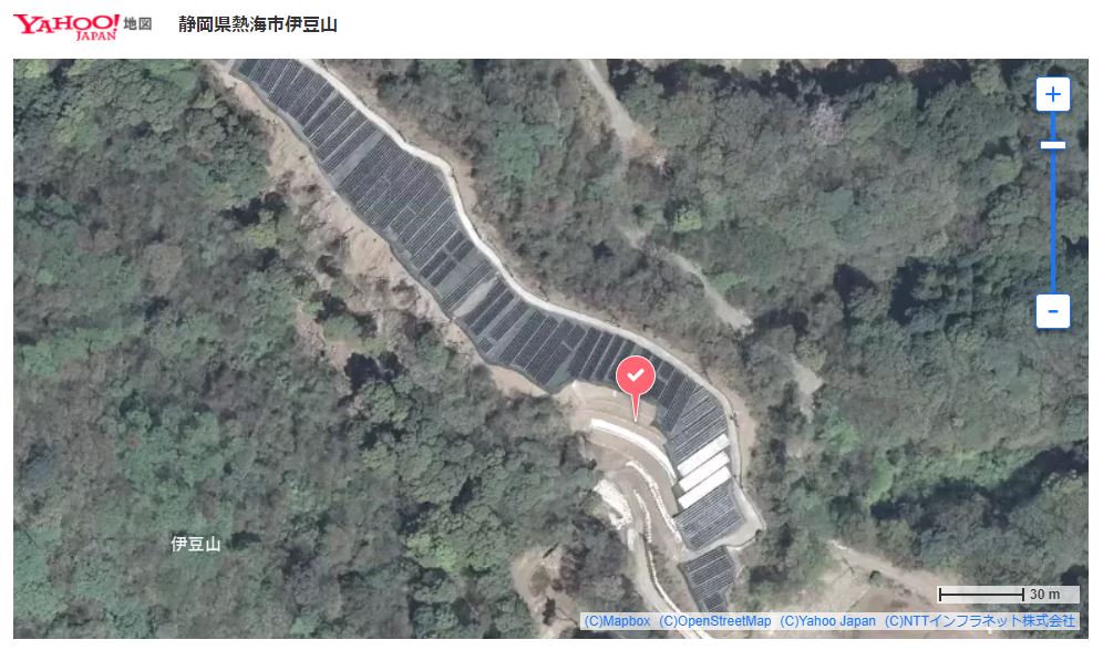 熱海の土砂災害現場から北西の山中にある平地。グーグルマップの航空写真ではソーラーパネルが表示されませんがYahoo!地図なら確認できます。