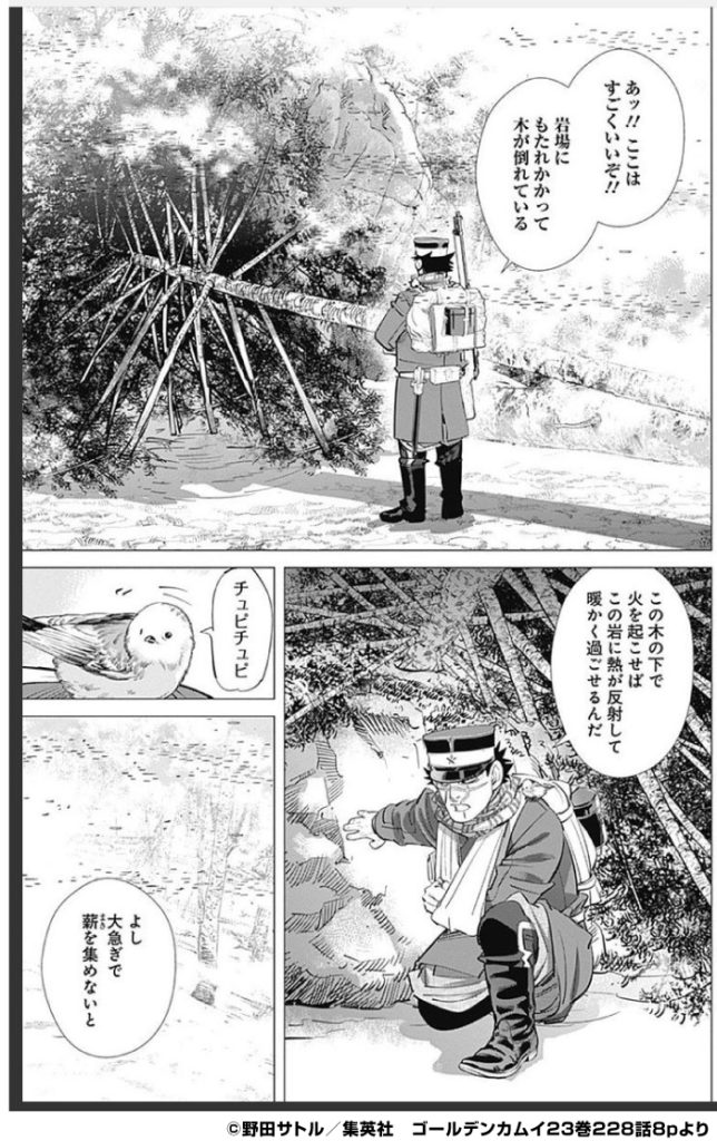 杉元「雪の上で薪を焚くと溶けた水で消えてしまうんだ」