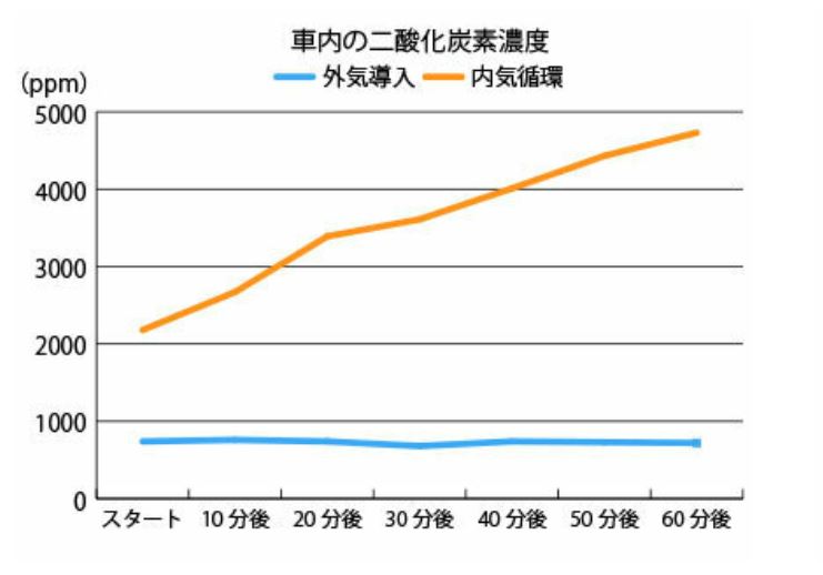 内気循環モード、たった15分で二酸化炭素濃度を高めます