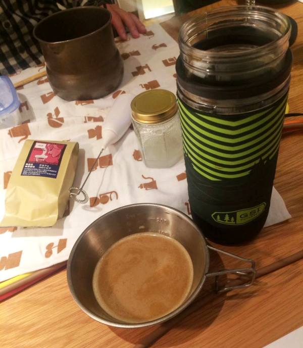 今回は先日「山と珈琲 岩湧山編」で登場したバターコーヒーを振る舞いました。イッテQ登山部の天国じじいこと貫田ガイドが紹介していたコーヒーで、これを飲み続ける事で5~6kg体重が落ちたとか、高山病に強くなったとか、身体的ポテンシャルが高くなったとか、色んな効果が期待できるとの事。