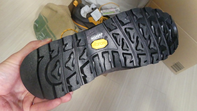 最初に取り寄せたのは、日本の伝統的な登山靴メーカー・キャラバンのトレッキングシューズ・GK21。靴の左右面がツートンになっていて海外アウトドアブランドのようなデザインがおしゃれ。妻からも「これかっこいいやん!」とコメントをもらいました。幅は3Eでゴアテックス、ソールもビブラムでかなりしっかりしています。